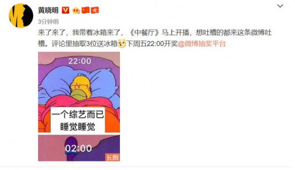 黄晓明发文送冰箱近日,黄晓明因综艺节目《中餐厅》中的表现引起热议,今晚新一期节目播出前,黄晓明发微博要大家来“吐槽”并抽奖送网友冰箱。黄晓明工作室随后转发并补充道:&ldquo