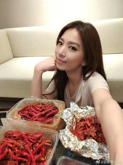 8月18日晚,田馥甄发博晒自拍和宵夜,并调皮调侃粉丝:“送上一张万爱宵夜图。来! 一人骂一句 ,看谁有创意!”图中Hebe身穿白色休闲T恤,长发披肩,再加上满桌小龙虾,十分诱人