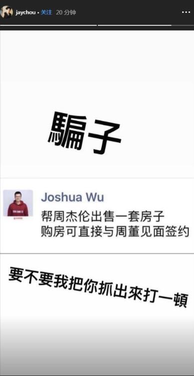19日,周杰伦在社交网站发文否认出售豪宅,并称:“骗子,要不要把你抓出来打一顿。”