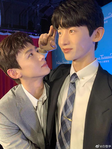 会玩!白敬亭晒与蜡像合影 粉丝:不要对自己的蜡像有非分之想