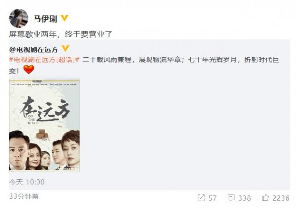 8月26日,马伊琍转发自己的新剧海报并配文:“屏幕歇业两年,终于要营业了。”