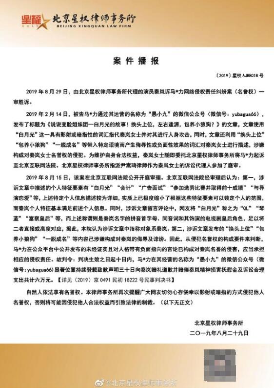 8月29日,北京星权律师事务所发布案件播报,称:“2019年8月29日,演员秦岚诉马*力网络侵权责任纠纷案一审胜诉。被告马*力因在其个人微信公众号“愚小九”中通过影