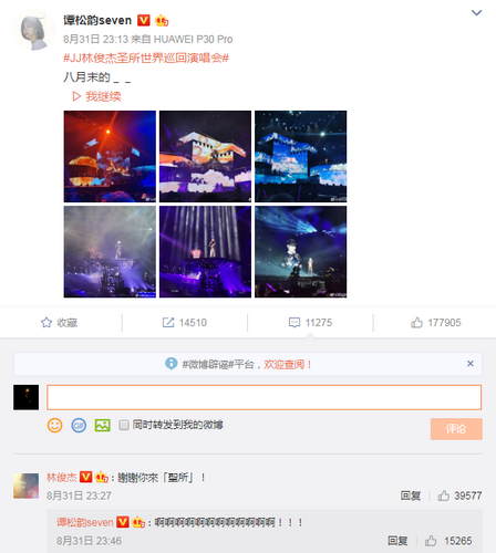 8月31日,谭松韵发微博分享自己在林俊杰圣所演唱会现场,随后获林俊杰点赞评论“谢谢你来圣所”,谭松韵立马变身迷妹回复十二个“啊”表达自己的激动。8月31