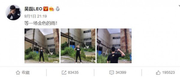 9月1日,吴磊在微博晒照并配文:“等一场金色的雨!”照片中,吴磊身穿印有电竞选手UZI名字字样的黑色T恤,寸头精神帅气。