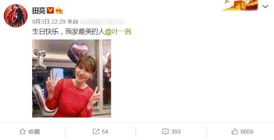 9月3日,田亮在微博晒出妻子叶一茜美照并配文“生日快乐,我家最美的人”,为叶一茜庆生。随后,叶一茜也在微博晒出与田亮的合照,并配文“说好的给我过生日,结果怎么一个比