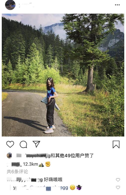 9月8日,李嫣在社交平台上晒出一张美照,写道:“12.3km”,似乎是趁着假日去登山。照片中云雾缭绕、森林密布,李嫣披散着头发,身穿蓝色短袖上衣搭配深色运动裤,手中还拿着一件厚