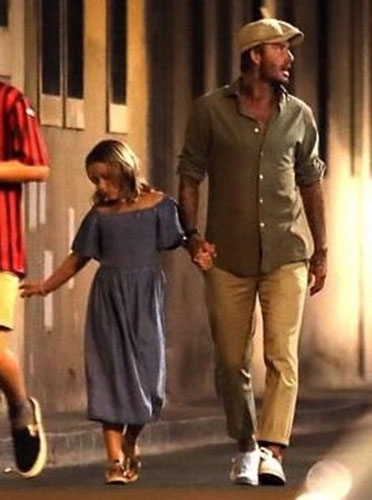 贝克汉姆一家出行,小贝牢牢的牵着女儿小七的手,十足女儿奴。