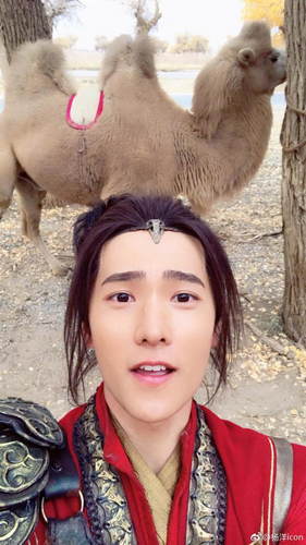 杨洋与骆驼合影表情搞怪 身穿红色戏服造型帅气