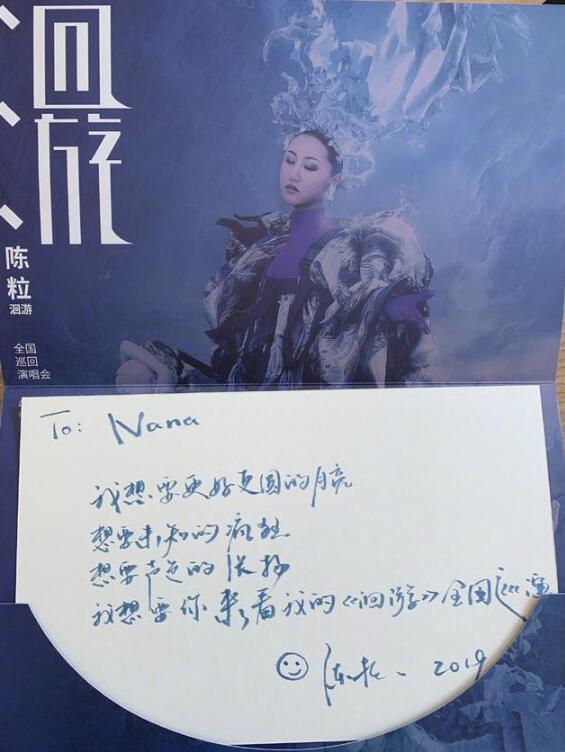 9月23日中午,欧阳娜娜晒出与歌手陈粒的合照和一封手写信,信上写着:“我想要你来看我的《洄游》全国巡演。”欧阳娜娜在微博公开回复:“谢谢陈粒邀请,我想要去你的《洄游》全国巡演。”