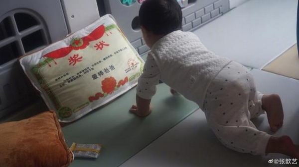 张歆艺晒宝宝爬行照 家中抱枕样式逗笑网友