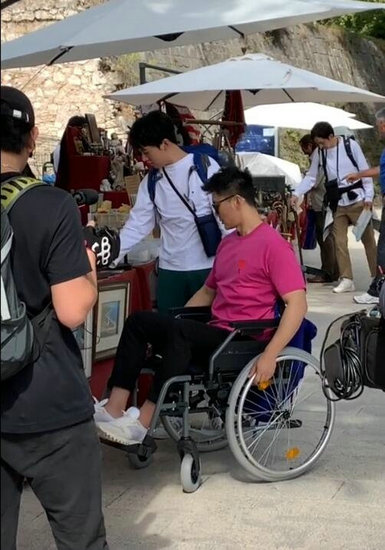 李晨国外录综艺受伤 粉色上衣配黑色裤子坐轮椅出行