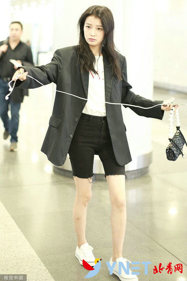 孙怡现身机场。她玩转男友风似偷穿董子健的西服,踩白色平底鞋大长腿笔直纤细,长发飘飘挂耳机又美又A。