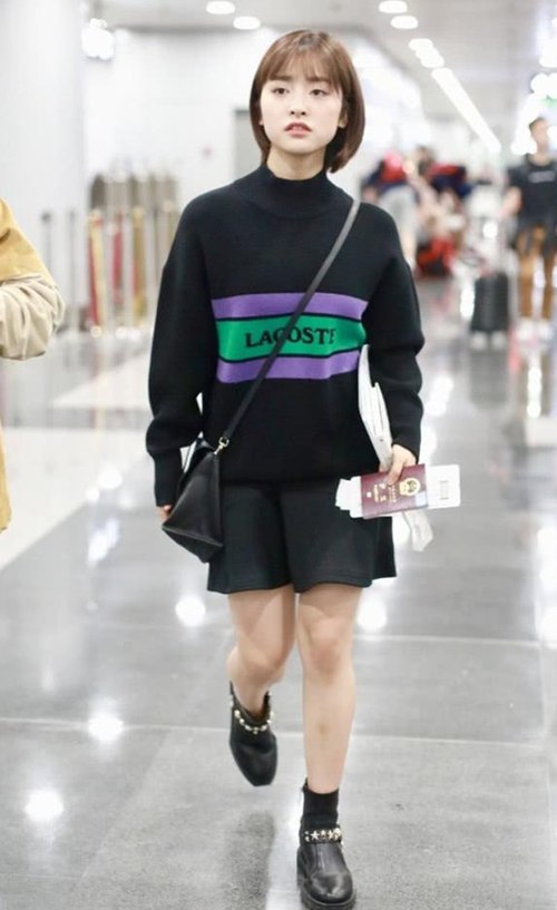 出发机场秀,毛衣短裙配短靴,非常乖巧的学生范儿穿搭,没有过多的搭配来铺垫自己的巴黎时装周之旅,风格清爽很适合她的气质。