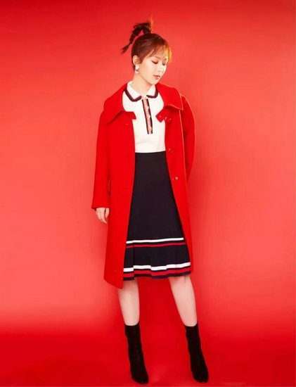 杨紫娇俏的麻花辫和制服风格的裙子,使得这款红色大衣有了几分俏皮和活泼。