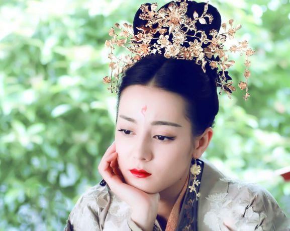 迪丽热巴一身贵妃装扮,搭配金灿灿的头饰,既高贵,又大方。