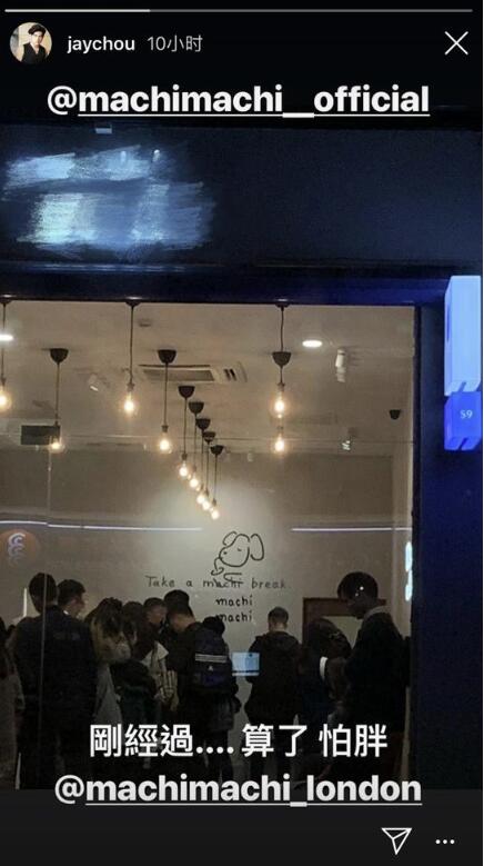 10月2日,周杰伦在社交网站上晒出一个小视频,视频中拍了一家他喜欢的奶茶店,然而周杰伦却在图片上配文“刚经过……算了怕胖”,透露自己这次终于拒绝了“奶茶的诱惑”。周杰伦爱奶茶人尽皆知,社交网站上经常能看到他捧着奶茶的照片,就连好友谢霆锋都在节目《中国新歌声》里公开送他奶茶,而周杰伦之前发胖也被网友认为是“喝奶茶喝的”。该条动态发出后,不少网友纷纷点赞周杰伦毅力可嘉,不过也有网友调侃称“肯定是嫌队伍长”、“哥哥勇敢喝,歌迷永相随”,十分好笑。