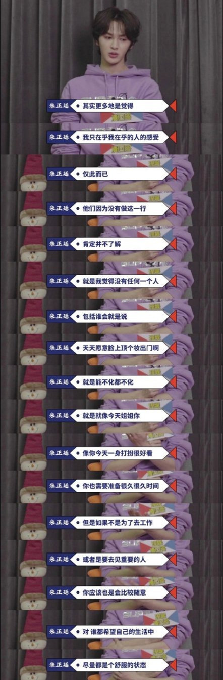 记者提问:“还会在意围绕你‘外在妆发’的争议吗?”朱正廷表示:“我只在乎自己在乎的人的感受,仅此而已。”又说“我觉得没有任何一个人,天天愿意脸上顶个妆出门,能不化就不化……谁都希望自己的生活中,尽量是一个舒服的状态。”