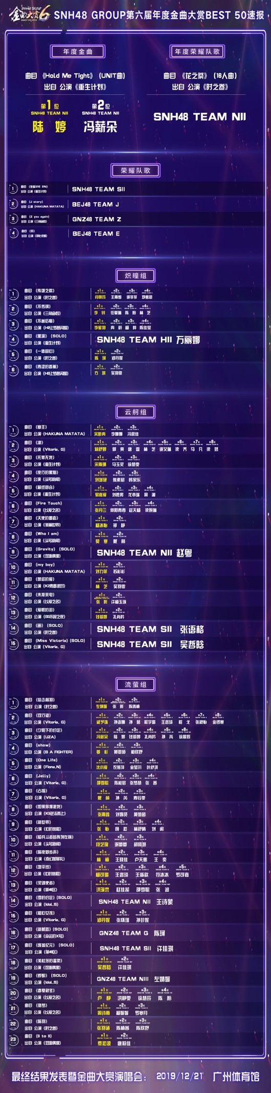 SNH48 GROUP第六届年度金曲大赏速报前50位歌曲、演唱组合及成员顺位提名:
