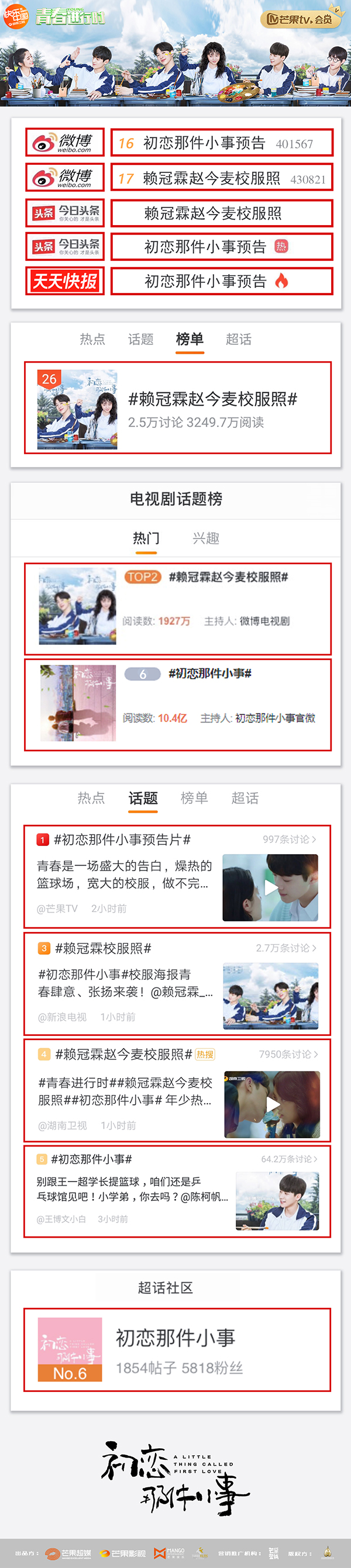与此同时,观众也在电视上首度看到《初恋那件小事》官方预告片,宣布即将在湖南卫视青春进行时剧场开播、芒果TV全网首播。赖冠霖、赵今麦等人将共同开启青涩懵懂的半糖气息,不少网友留言表示被满屏的青春气息甜哭,“坐等开播”。