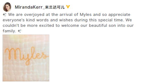 10月16日,米兰达可儿发博宣布三胎得子的好消息,内容翻译为:“Myles的到来使我们喜出望外,在这个特殊的日子里,感谢每个人的真挚祝福!欢迎可爱的儿子加入我们的家庭,我们太兴奋了!&rd