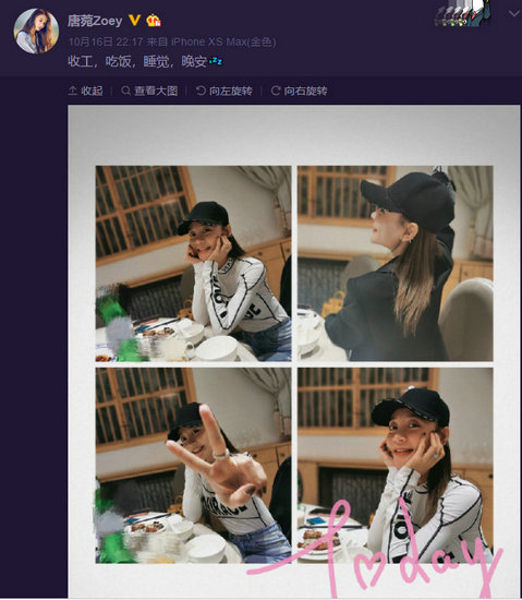 唐菀深夜晒美照 比V甜笑状态依旧心情好