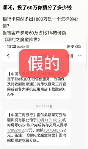 10月17日,网上流传一张关于《哪吒》票房分账的截图,图中显示当事人用60万参投《哪吒》,并最终得到1800万院线票房收益分红。媒体片方求证此事之后得到回复,称截图显示的是“假消息&rdq