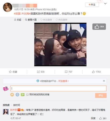 10月17日,有网友在个人社交账号上晒出了吴磊和陈乔恩杀青时的亲密合照,合照中陈乔恩搂着吴磊,看起来两人关系非常亲密。照片配文:“吴磊和陈乔恩高甜宠溺啊,你这对cp怎么看?”
