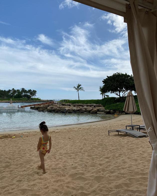 10月22日,陈冠希在个人社交网站上分享带女儿沙滩度假的照片,照片中Alaia穿连体泳衣,双脚交叉站在沙滩上,扎丸子头背影呆萌可人。