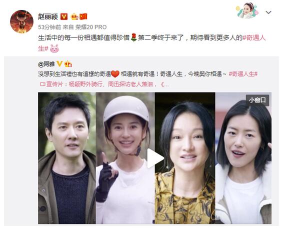 10月23日,赵丽颖转发了阿雅发布的《奇遇人生2》的宣传片为该节目助阵,她说:“生活中的每一份相遇都值得珍惜,第二季终于来了,期待看到更多人的奇遇人生。”