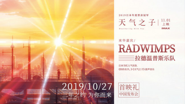 继宣布新海诚来华之后,日本2019票房冠军《天气之子》官方再曝一则重磅新闻:影片音乐原声、日本超人气乐队RADWIMPS确认空降内地,于10月27日与导演新海诚一同出席中国发布会及首映礼!