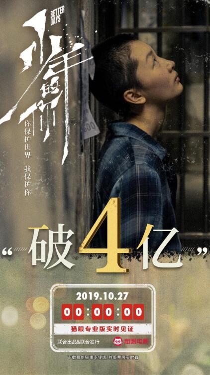据猫眼数据显示,截至今日0点0分,由曾国祥执导,周冬雨、易烊千玺主演的电影《少年的你》票房突破4亿,共用时39小时。影片今日排片率47.1%,截至目前累计票房4.27亿,即将突破5亿。