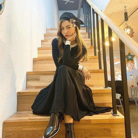 在公开的照片中,Luna头戴黑色贝雷帽,身穿黑色连衣裙,坐在台阶上凝视着前方。据悉,最近Luna离开SM与HUMAP Contents签订了专属合约。