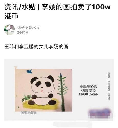 近日有网友发现,李嫣早前的一幅画拍卖了100万港币,价格惊人。李嫣的画作名称是《熊猫与竹》,画中一只大熊猫手里拿着竹子,而它的身边也有一颗竹子,天上则有一只蓝色的鸟。整幅画看上去比较简单,但是很有生机,而且能够看出画中的童心。
