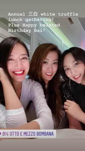 10月29日,吴佩慈好闺蜜Jolene 在其个人社媒分享近照,晒出自己与对方以及另一位好友白歆惠聚餐的合影。只见Jolene 配文写到“Annual 三白 whitetruffle lunch gathering!Plus Happy belated Birthday Bai!”送上迟来的生日祝福!)