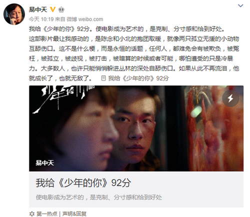 10月31日,易中天在微博发布长文点评电影《少年的你》:“我给《少年的你》92分。使电影成为艺术的,是克制、分寸感和恰到好处。这部影片最让我感动的,是陈念和小北的抱团取暖,就像两只孤立无援