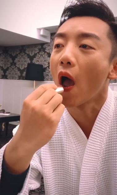 视频中,郑恺身穿白色浴袍,拿着口红涂抹,涂完还嘴巴“吧唧吧唧”两下,动作十分熟练自然,然后用叉子叉起一大块食物放进张着大大的大红嘴巴里,生怕食物碰到口红,样子非常的滑稽夸张,又不失妖娆。