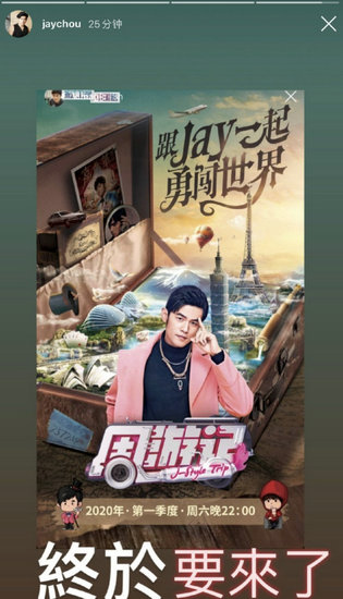 近日,周杰伦通过个人社交平台发布《周游记》海报,官宣自己与好朋友的旅行节目定档。海报上显示《周游记》将在2020年第一季度周六晚22点播出。
