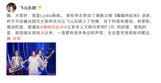 很有幸去参加了湖南卫视《嗨唱转起来》录影,昨天节目播出因为大家的关注让飞儿乐团[微博]上了热搜,当下的我有激动、有害怕,激动的是,感谢在#嗨唱转起来#让更多人又再次听到F.I.R. 的好歌,害怕的是,我知道从我加入以来,一直都有很多争议的声音,无论是支持或批评建议,我都由衷感谢,这些都是让我不断往前努力的动力,我会更加油的!
