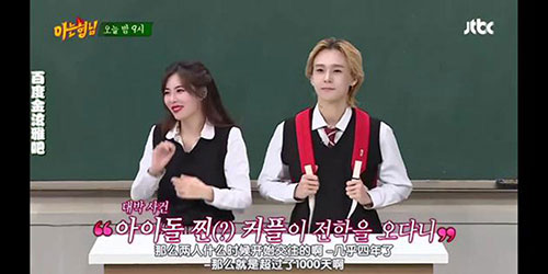 歌手泫雅和男友金晓钟作为嘉宾参与综艺《认识的哥哥》。在节目中,泫雅自曝曾暗恋金晓钟一年半,并透露向其告白的细节:当天我喝了酒,然后跟他说“我会等你的”。金晓钟回复:“为什么,现在交往不行吗”!