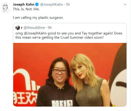 近日,国外很多网友把高晓松误认成了是霉霉的MV御用导演Joseph Kahn,甚至以为他要执导《Cruel Summer》MV。随后Joseph在社交网站幽默发文澄清:“这不是我,我得给我的整形医生打电话了”。
