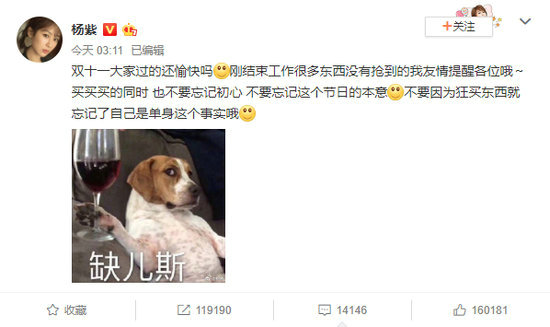 11月11日凌晨三点,杨紫发博称:“双十一大家过的还愉快吗?刚结束工作很多东西没有抢到的我友情提醒各位哦~买买买的同时,也不要忘记初心,不要忘记这个节日的本意,不要因为狂买东西就忘记了自己是单身这个事实哦。”