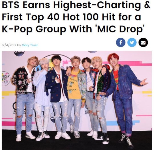 防弹少年团不久前出席2017American Music Awards,以一首《DNA》吸引了全球观众的目光,这次《MIC Drop》初上榜就排名Billboard Hot 100第28位,也充分显示了防弹少年团在美国火速上升的人气。