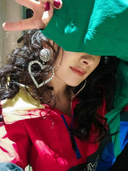 杨幂分享挡脸自拍皮肤水嫩 超大心形耳环格外亮眼
