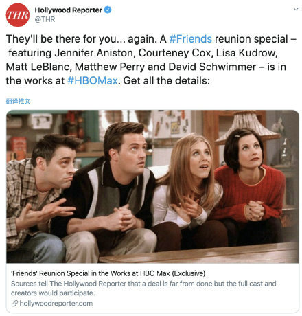 据外媒报道,华纳的新流媒体平台HBO Max已在开发《老友记》重聚特别篇,六名主演和原剧主创David Crane和Marta Kauffman都加入,目前正在洽谈阶段,但尚未敲定,合同也还没签,所以