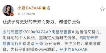 11月13日晚,时尚芭莎官宣王菊将出席芭莎明星慈善夜,芭莎主编转发微博表示欢迎,但却将“王菊”写成了“张菊”:“让孩子有更好的未来努力,谢谢