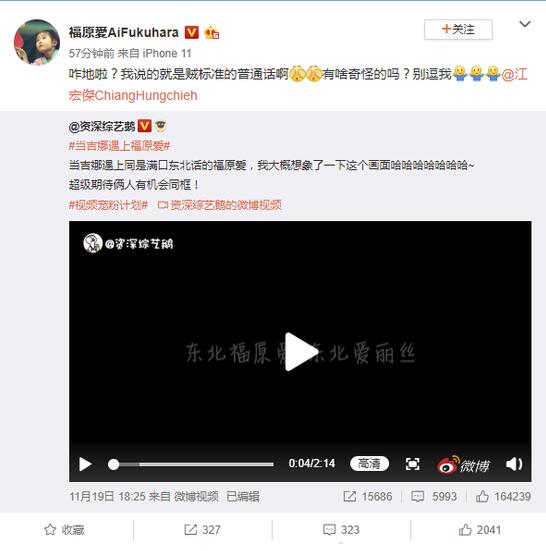 11月20日,福原爱转发网友制作的她与吉娜的东北话视频,并配文:“咋地啦?我说的就是贼标准的普通话啊,有啥奇怪的吗?别逗我。”