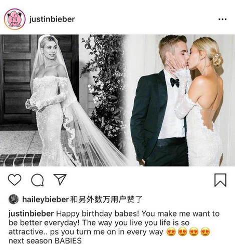 比伯22日在IG上晒出婚礼照片,并写下:“生日快乐宝贝!你让我每天都想变得更好,你的生活方式是如此有吸引力。”超甜蜜的情话闪瞎网友,然而他在文末写上了“next season BABIES”,Baby一词使用的是复数用法,让不少人猜测是在间接透露喜讯,“我看到大写的宝贝们了!”“BABIES让我很怀疑”“难道嫂子有喜了?”“要当爸了?”也有网友羡慕恩爱的小两口“羡慕海莉有个这么帅气,还这么爱她的老公”“有才有颜还这么浪漫”“希望一直幸福下去”。