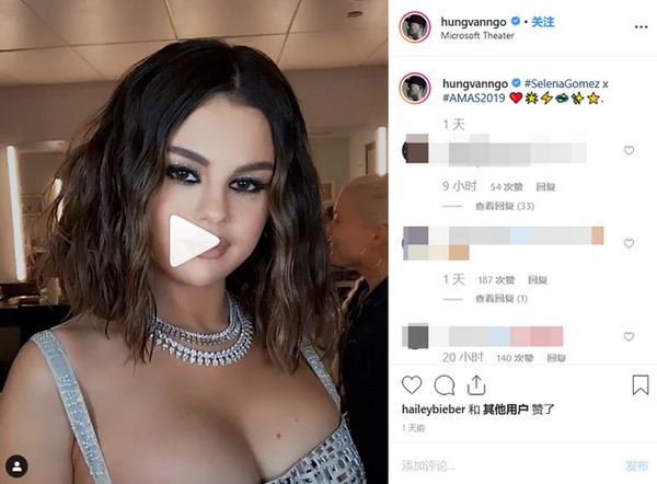虽然贾斯汀·比伯和海莉·鲍德温没有列席颁奖礼,她却悄悄点赞了一段化妆师黄万戈发布的赛琳娜在开场秀前的视频。粉丝注意到,短片发布不到一个小时,海莉就点了赞。