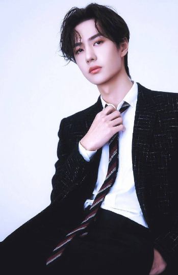 看王一博的黑色西装穿搭。他搭配了一条深色系的花纹长领带,优雅贵气,如同从漫画中走出来的王子。