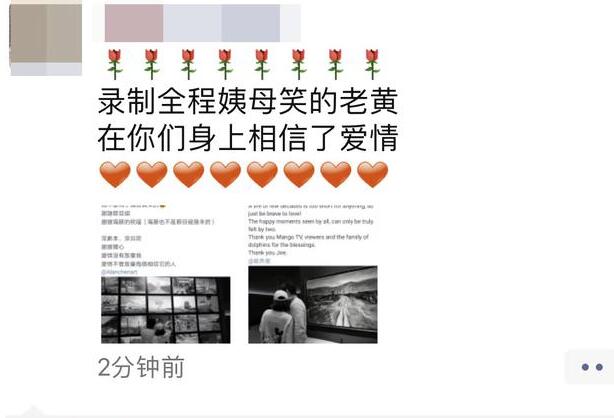 稍晚,陈乔恩经纪人也在朋友圈发文:“录制全程姨母笑的老黄,在你们身上相信了爱情。”